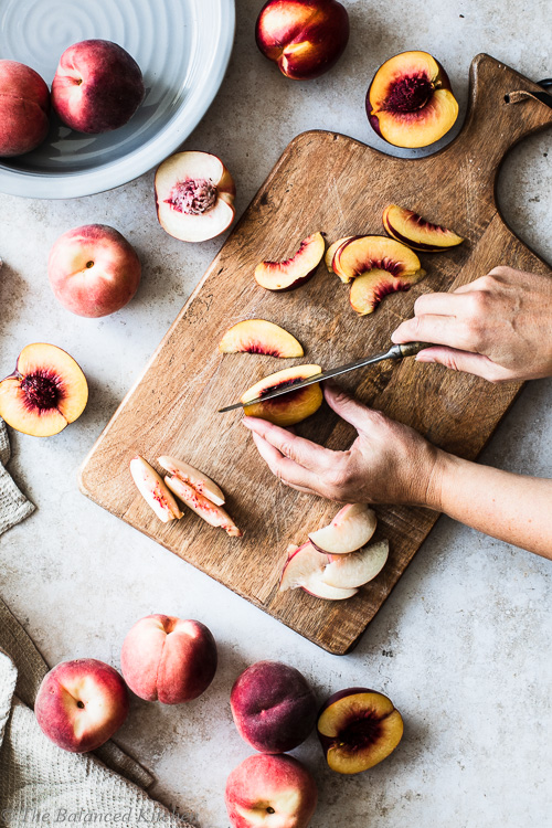 • On a clean cutting board and using a sharp knife, slice the fruit away from the stones and into thin, equal-sized segments.